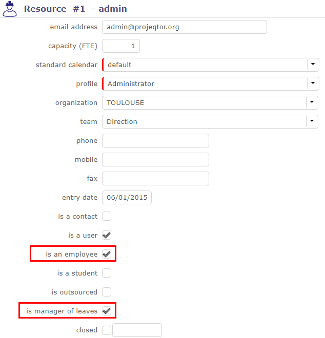 A manager is a resource whose properties “is an employee” and “is absence manager” are checked.